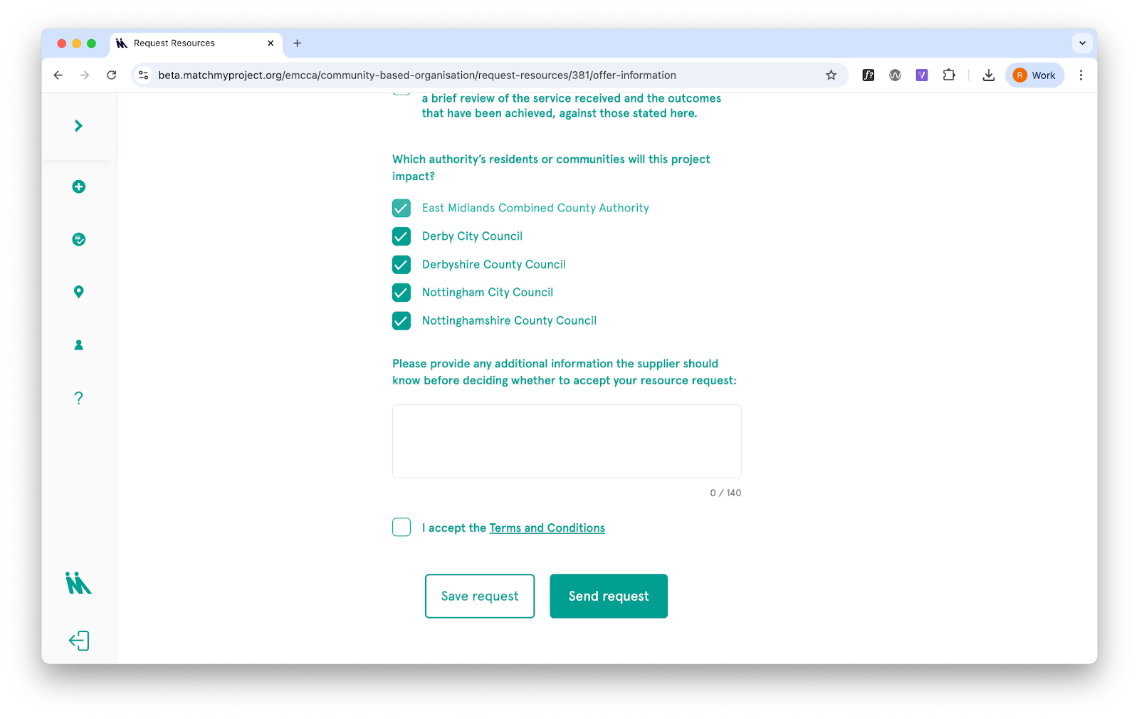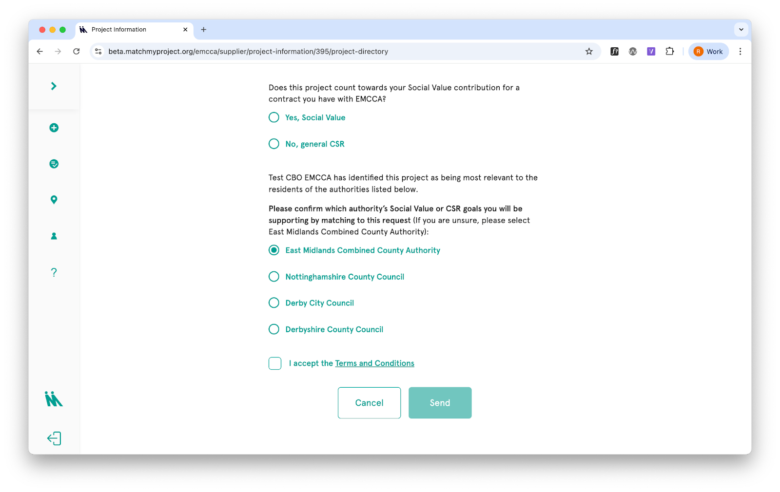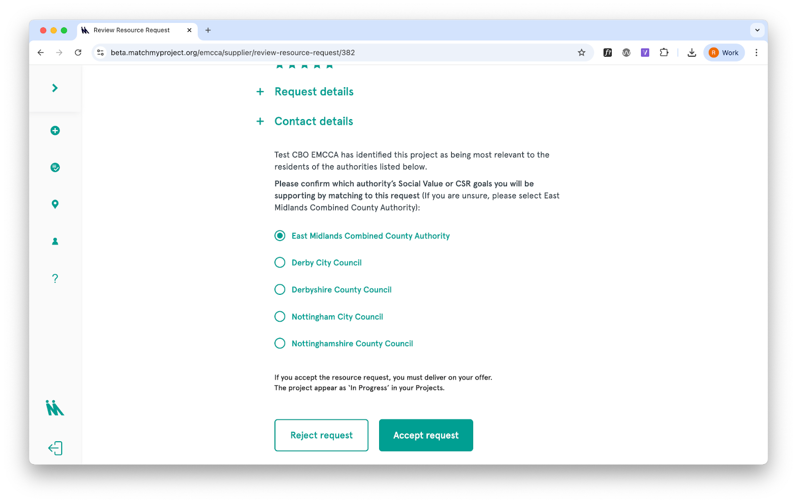 Suppliers confirm which authority the project is connected to at the point of match. They see a list of authorities based on what the community organisation selected (or the revised list if edited by the authority). This tag determines which authority’s impact data the match counts towards.