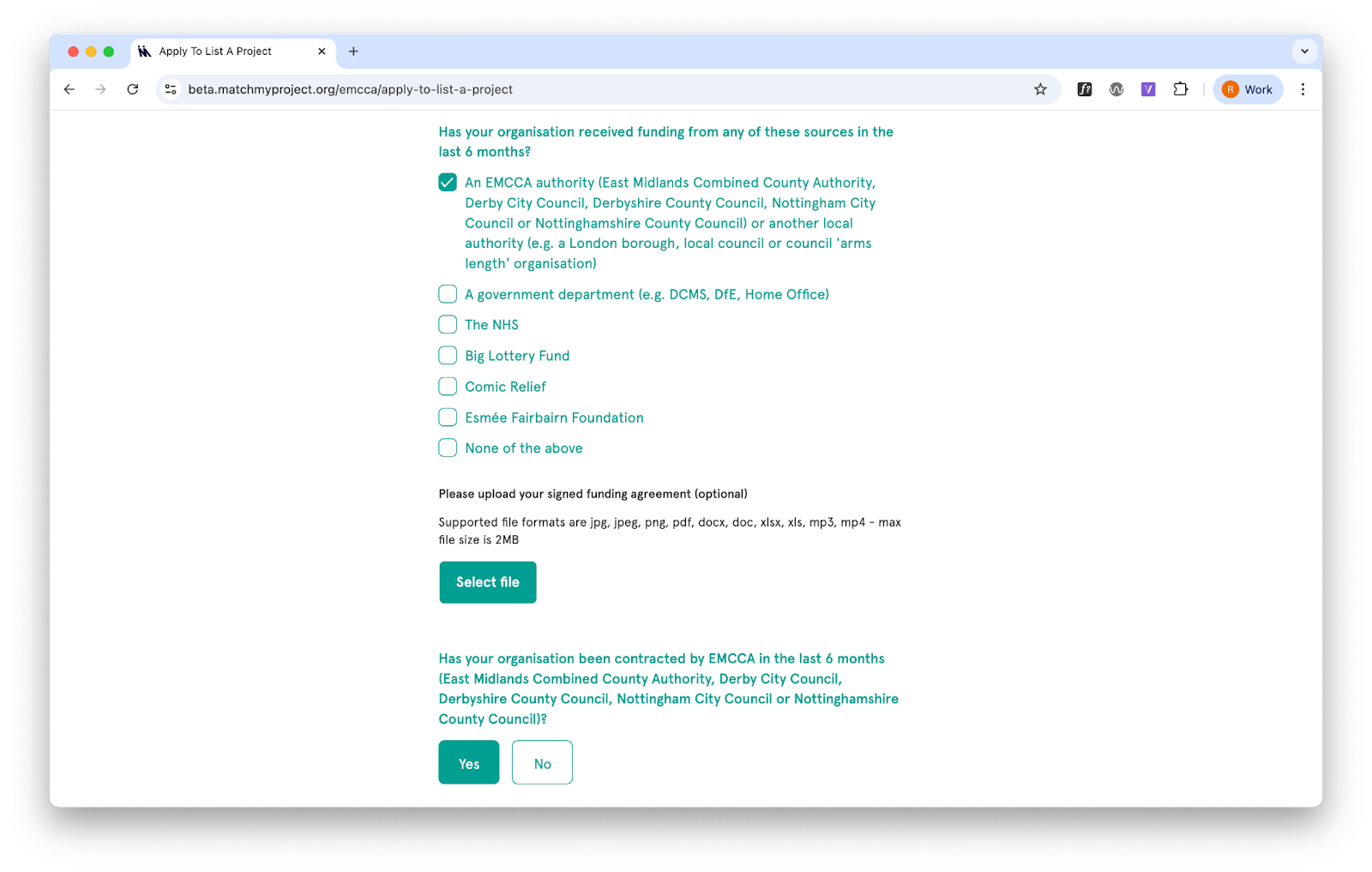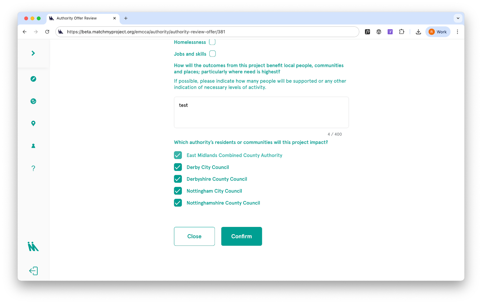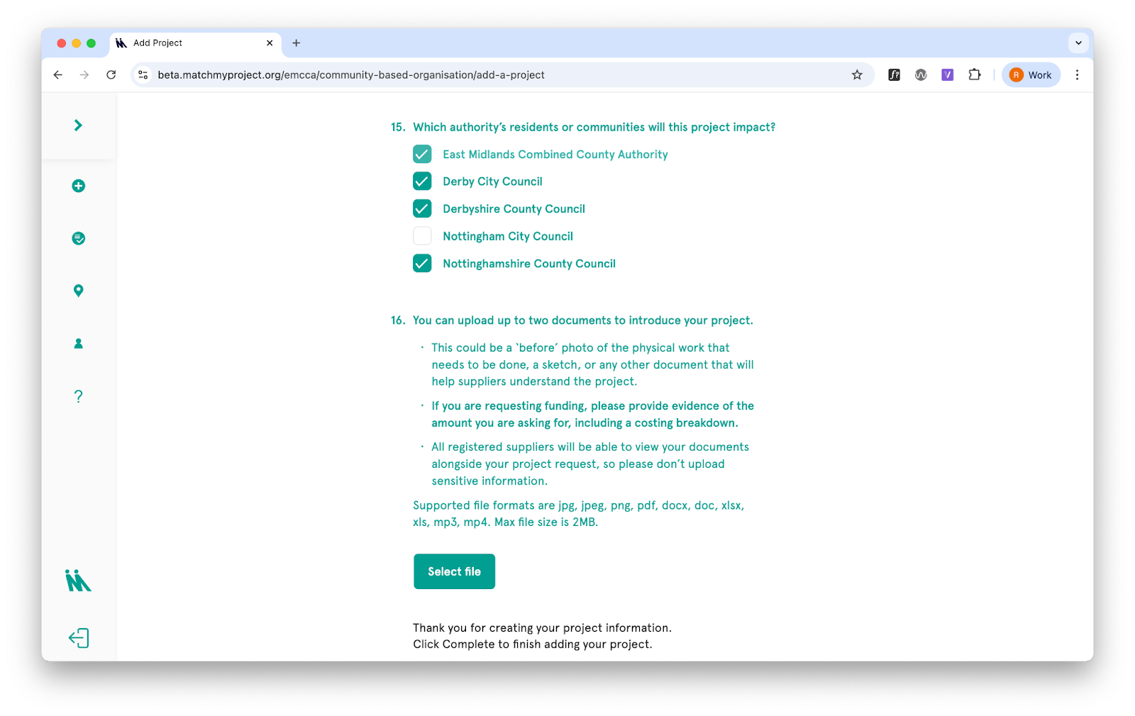 Suppliers confirm which authority the project is connected to at the point of match. They see a list of authorities based on what the community organisation selected (or the revised list if edited by the authority). This tag determines which authority’s impact data the match counts towards.