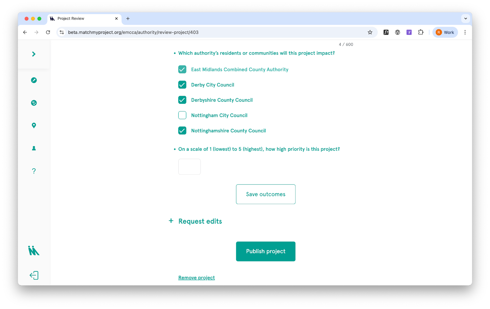 The authority can see (and edit) the relevant information under the project’s ‘Project outcomes’ and ‘Business outcomes’.