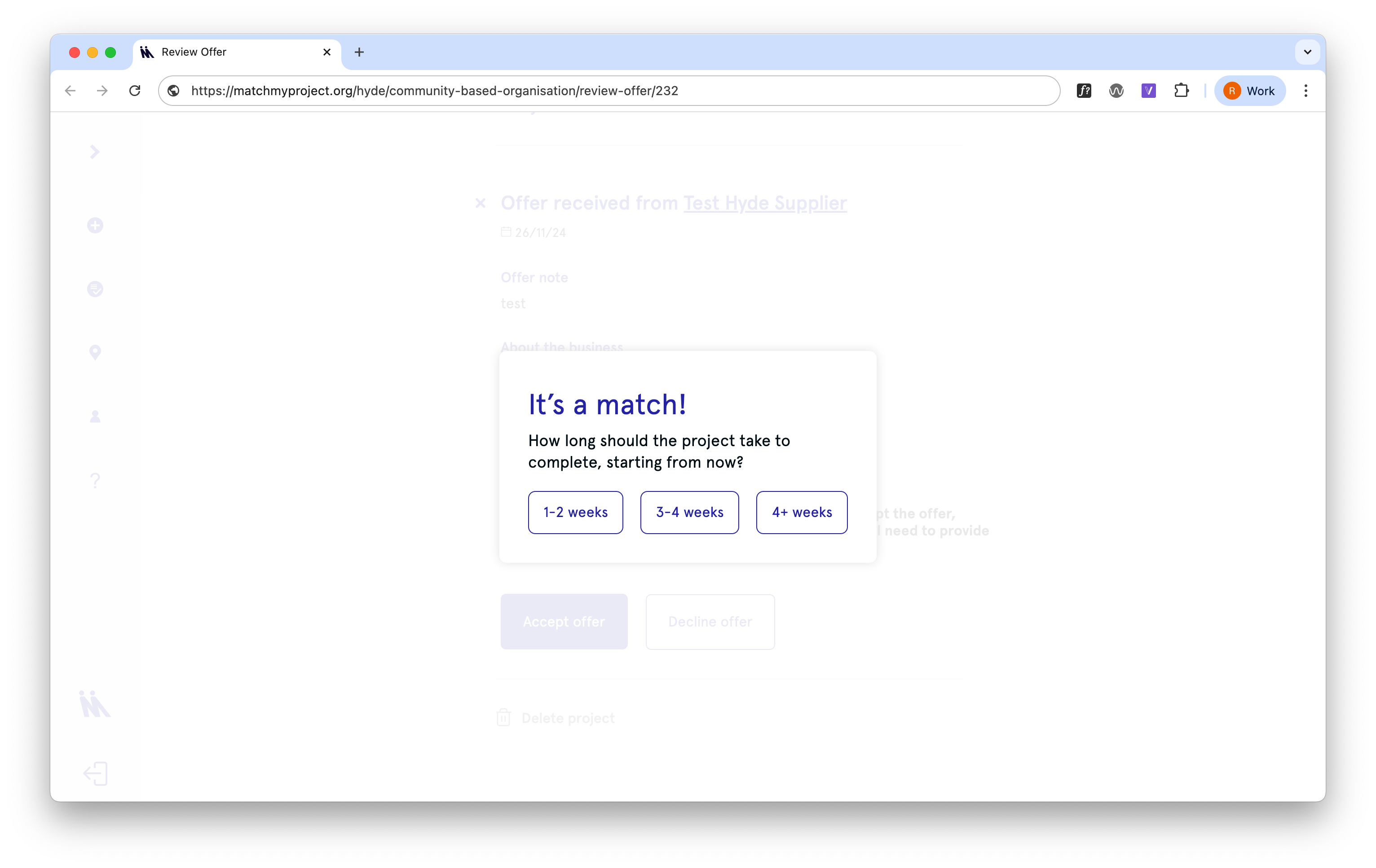 The organisation that accepts the request to match is asked how many weeks the project should take.