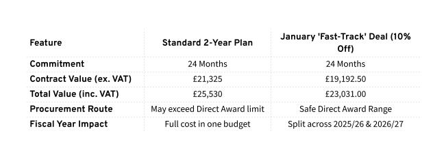 Our 10% discount does more than just save money; it strategically brings the total contract value safely under the £25k threshold (inc. VAT), bypassing the need for a lengthy formal tender.